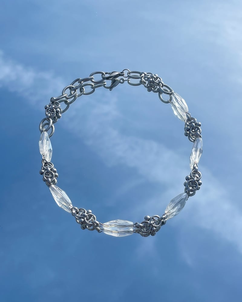 Hand-assembled using stainless-steel chainmail links paired with elongated clear glass beads β¦ creating a refined icy silhouette with a soft, crystalline shine. The contrast between the structured metal knots and the faceted glass elements gives the piece an angelic yet modern Y2K aesthetic.