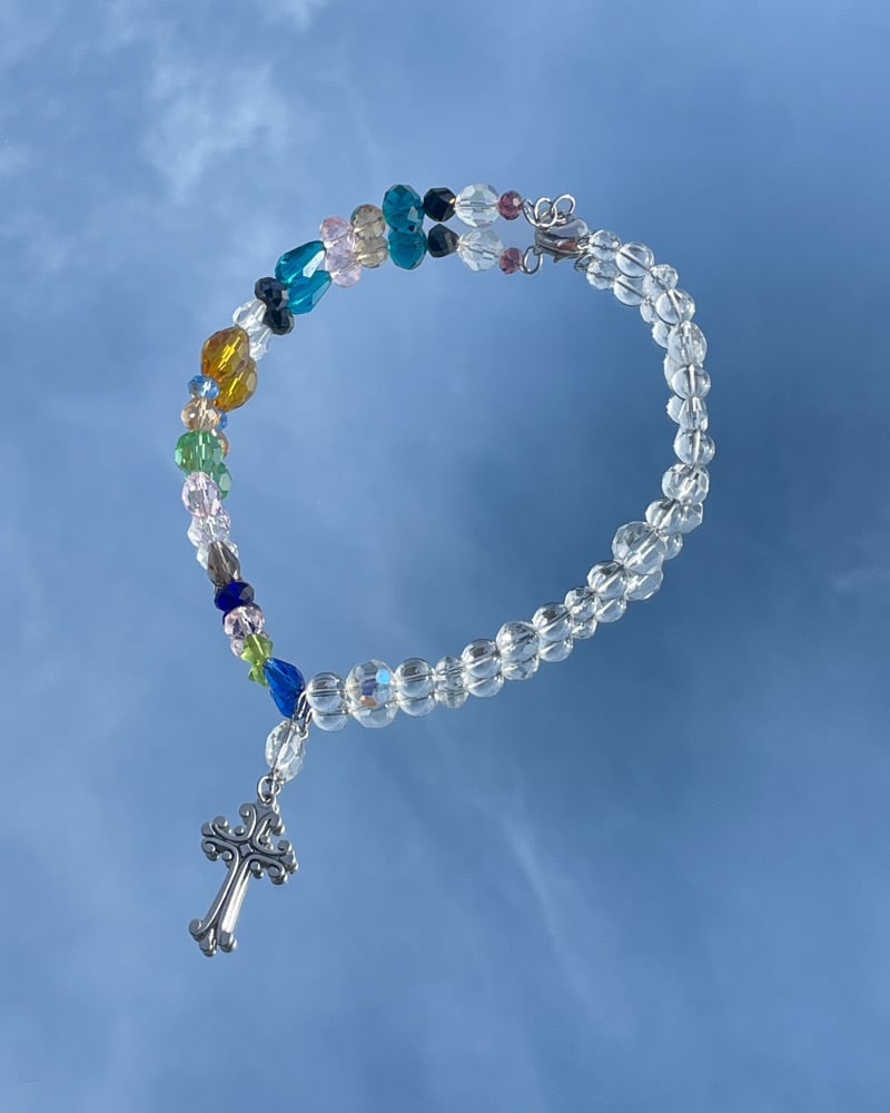 Hand-assembled using a mix of clear and multicolored faceted glass beads β¦ arranged in an asymmetric gradient for a soft rainbow sparkle. Finished with a second-hand high-quality cross pendant and stainless-steel hardware for a celestial Y2K touch. The icy clarity of the glass contrasts beautifully with the spectrum accents, creating a vibrant yet delicate angelic aesthetic.
