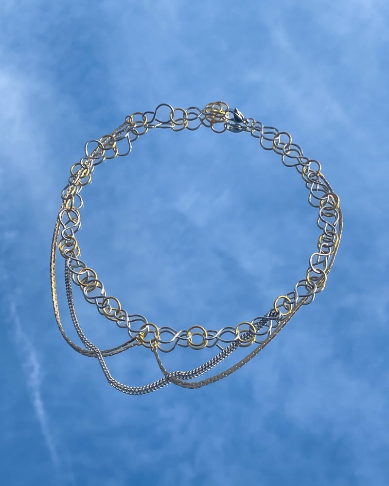 Hand-assembled using fully stainless-steel components in mixed silver and gold tones β¦ an intricate interplay of doubled links and layered chains creates a modern Y2K chainmail aesthetic with a clean metallic shine.